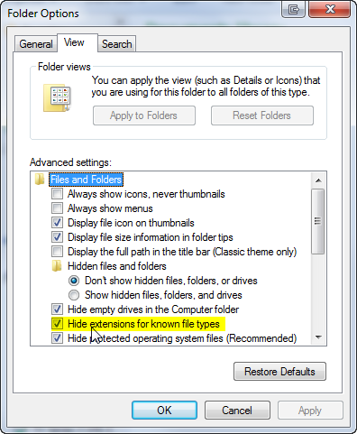 There you will need to uncheck Hide extensions for known file types.