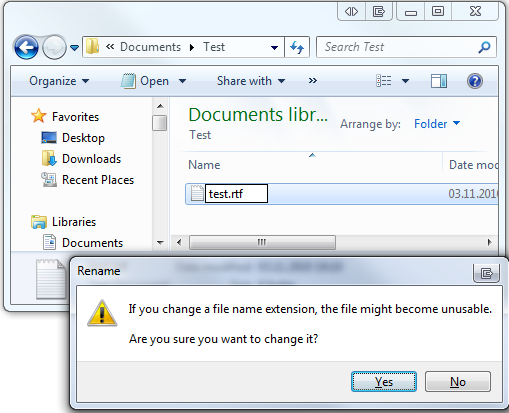 Here the file has been saved with the new extension, after pressing enter a windows tells you that changing extensions can cause the file not to work and asks