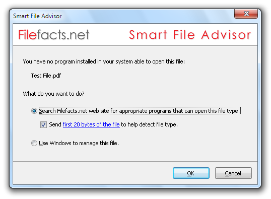 Sometime you may come across a files extension that is not associated with any software on your computer or the file wont have an extension. This is where Smart File Advisor will help you find appropriate programs to open your files using Filefacts large web site database.